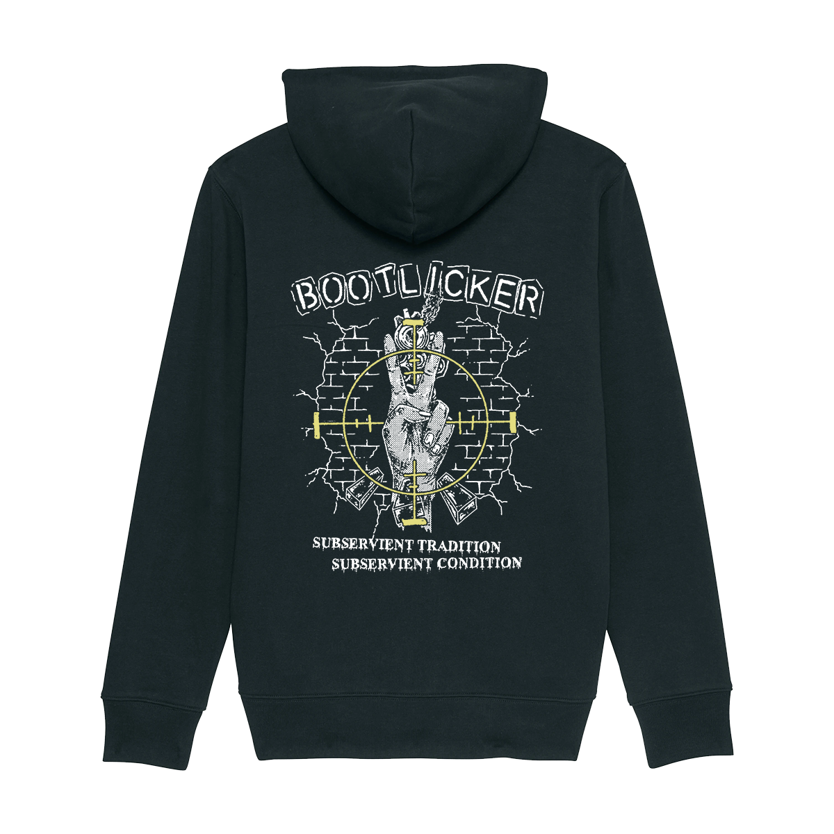 BOOTLICKER – Subservient Tradition black zip hoodie (white/yellow print)