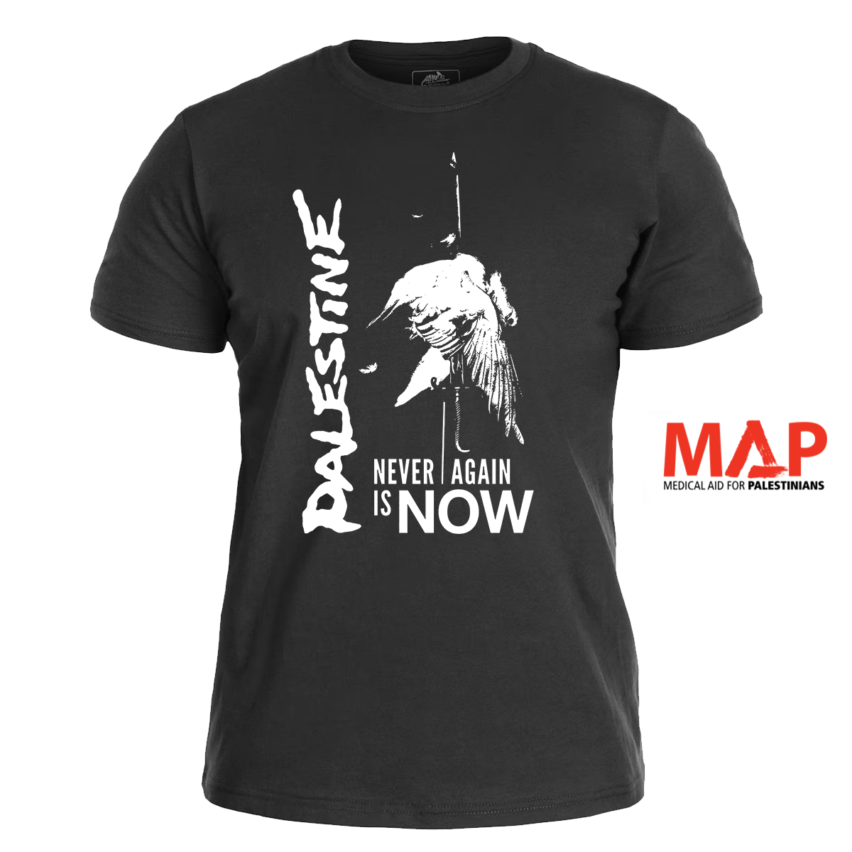 PALESTINE – Never Again – Discharge Ripoff black t-shirt (white print)